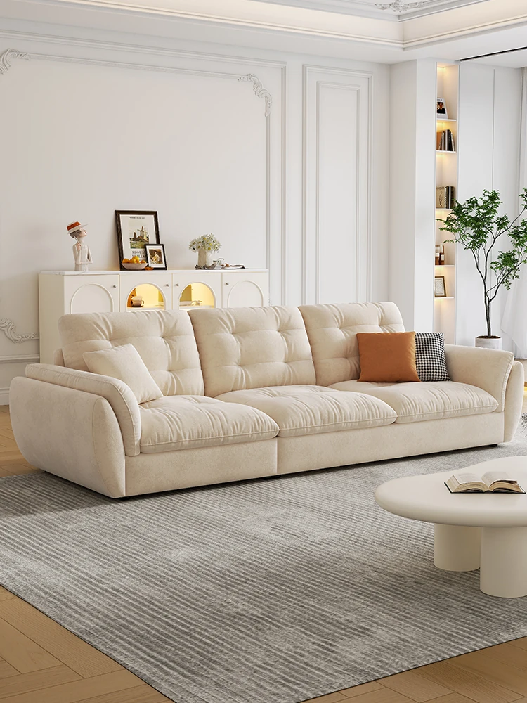 フランス風ミストクリームクッションソファ - 小型リビングにぴったり!軽量ラグジュアリーなファブリック、シンプルでモダンな3人掛けソファ。愛猫に優しい素材でキズも安心!