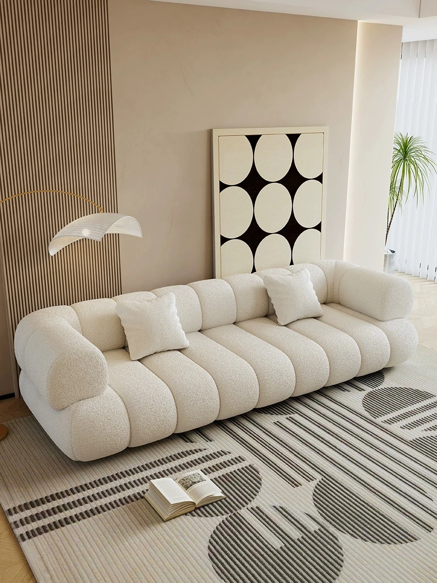風味豊かなクリーミーな北欧デザイン!トレンドの子羊ファブリックで仕立てたコンパクトなインス風「クラウドコットンキャンディ」リラックスソファ。居心地満点のモダンリビングルームを演出する完璧な一品!