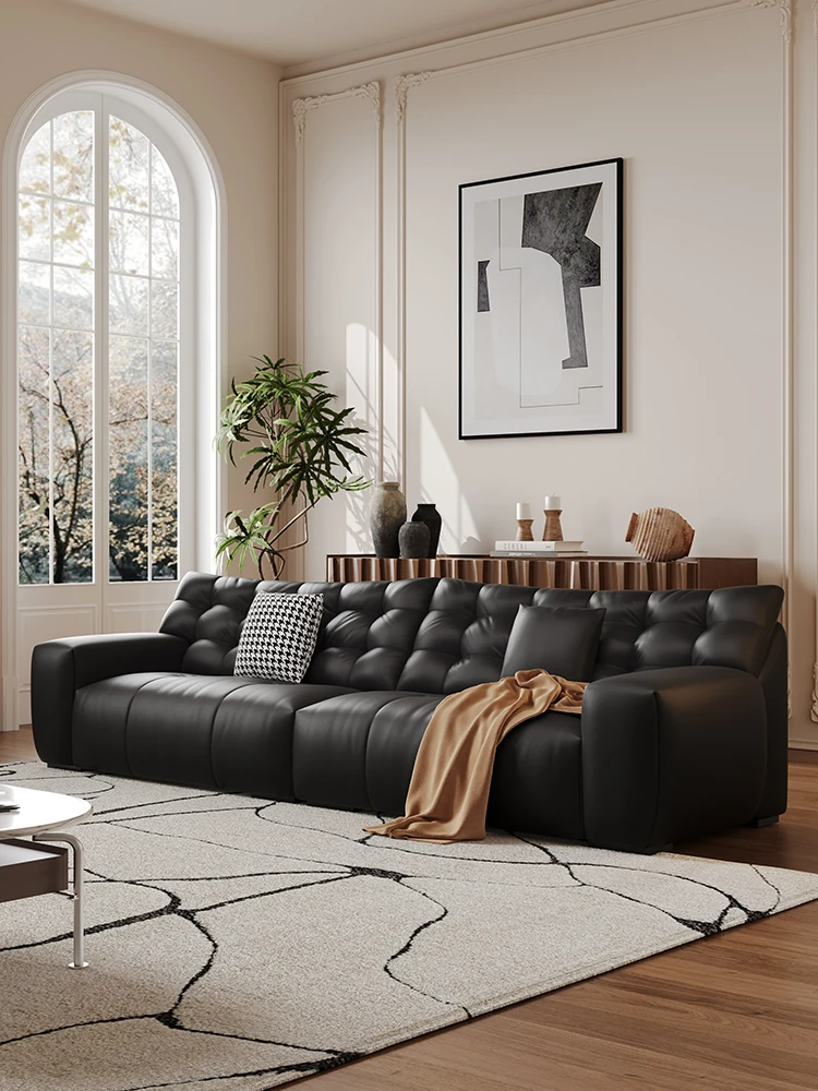 イタリア風シンプルデザインのブラックレザーソファ - クマのような包容感!レトロでモダンなリビングにぴったり、高級感あるビッグスペース向け設計