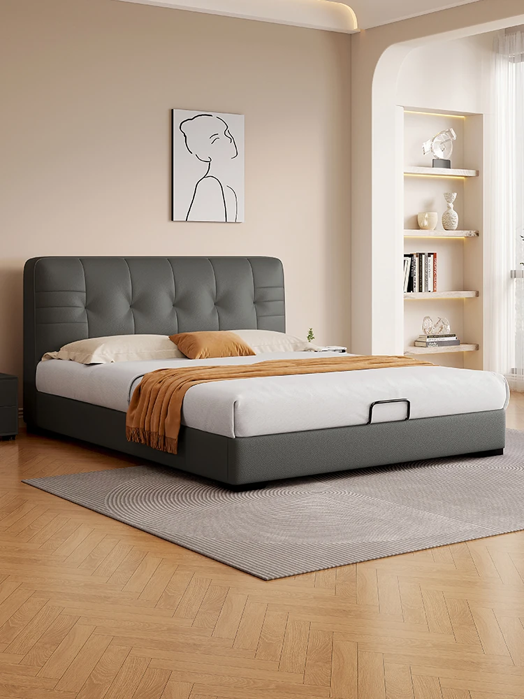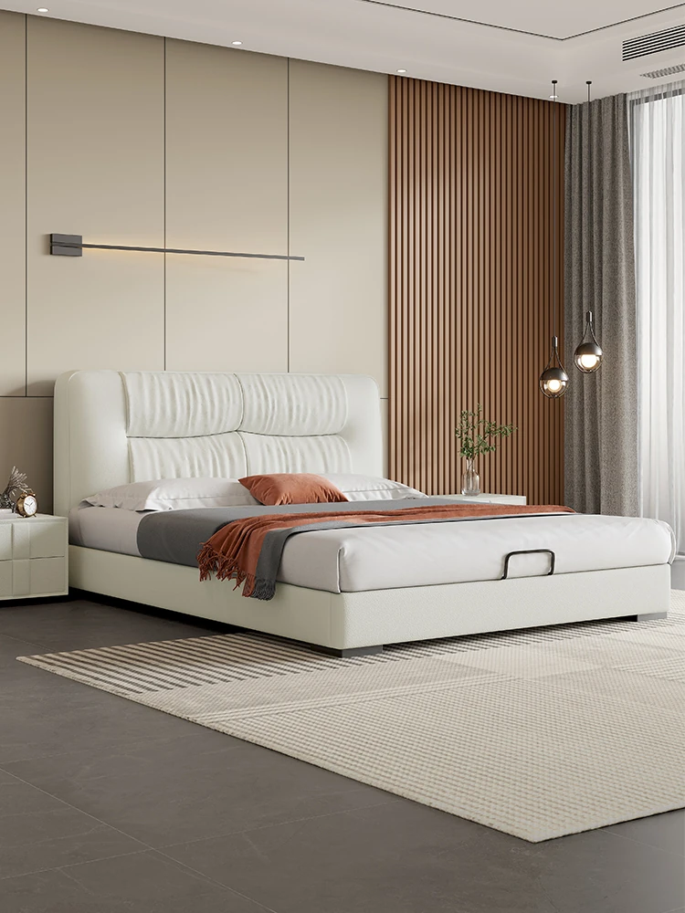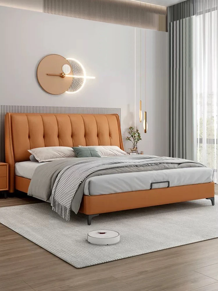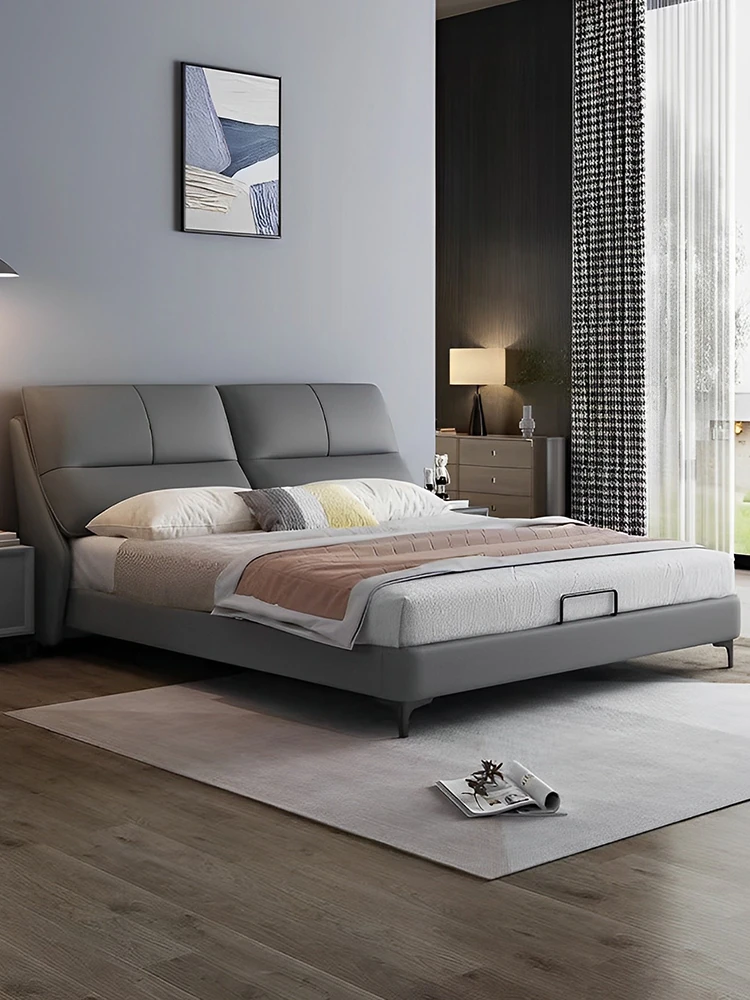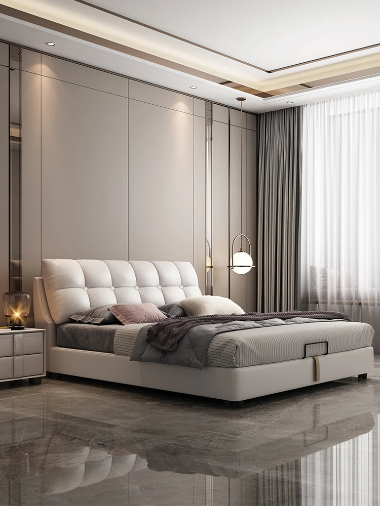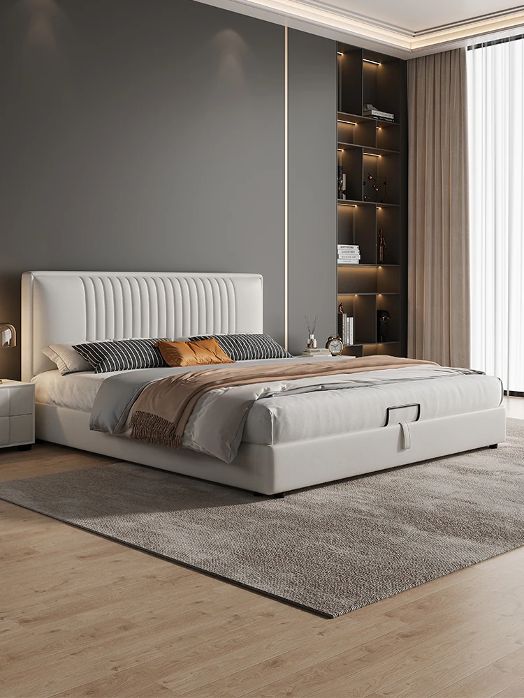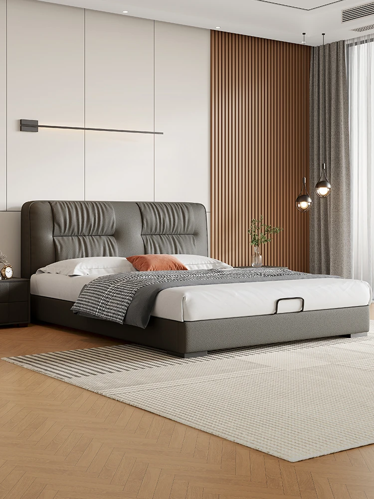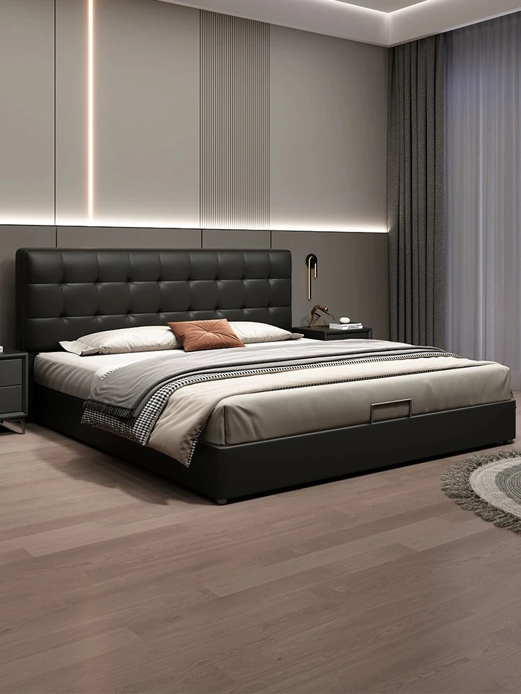 Luxurious Modern Genuine Leather Bed - Elegant & Stylish Upholstered Storage Bed for Master Bedroom