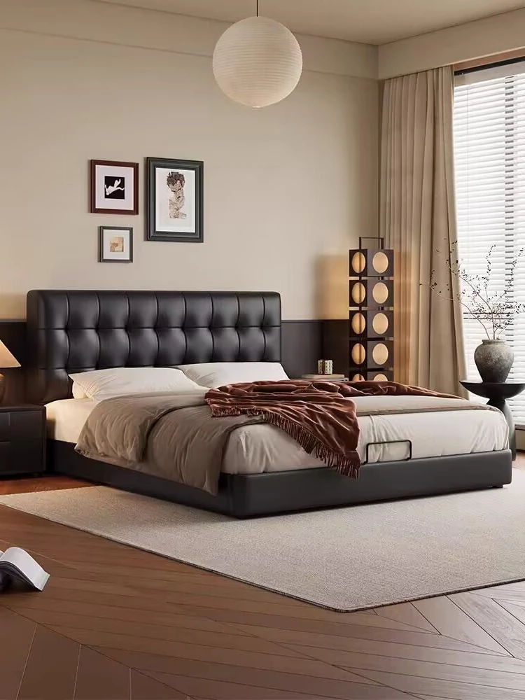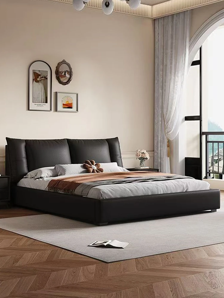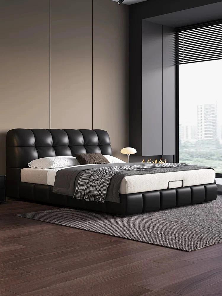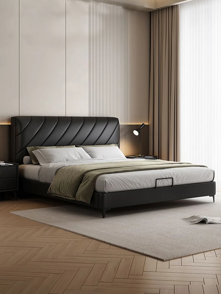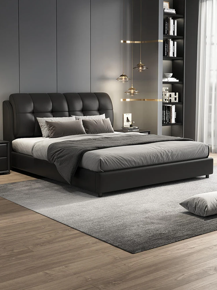 Luxurious Italian Minimalist Black Genuine Leather Bed - Modern Soft-Padded Design for Master Bedroom, Perfect for Newlyweds and High-End Décor