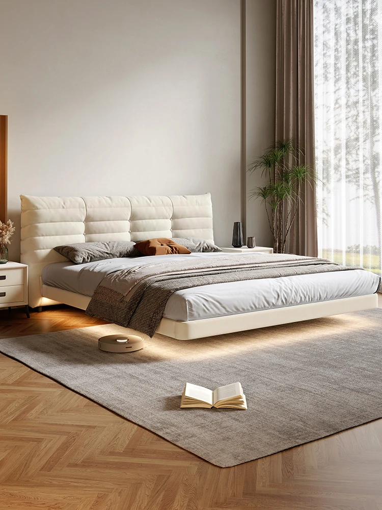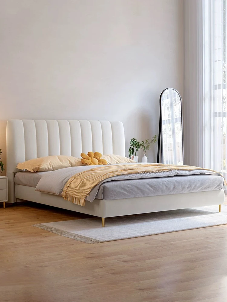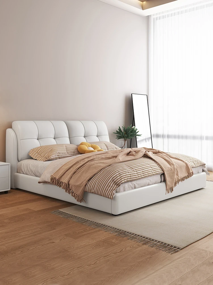 Luxurious Genuine Leather Bed - Modern Minimalist Design for Master Bedroom, Solid Wood Padded Double Bed, Cream Aesthetic, Available in 1.5m and 1.8m, Perfect for a Stylish Master Suite or Newlywed Retreat