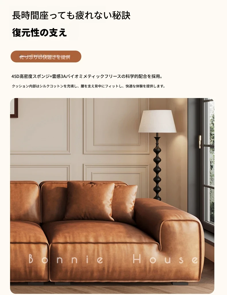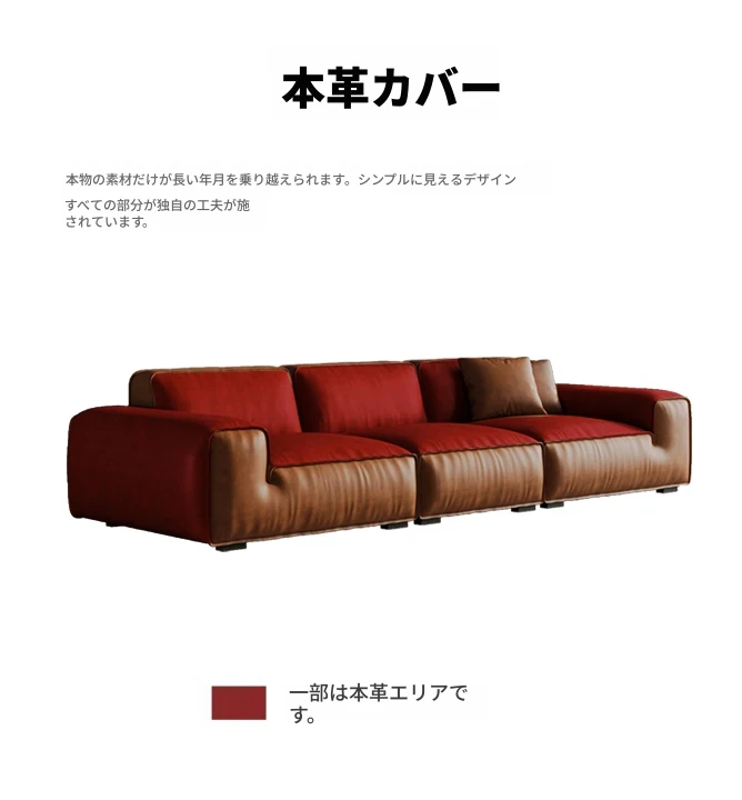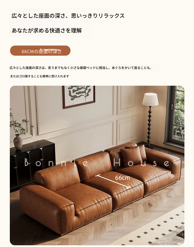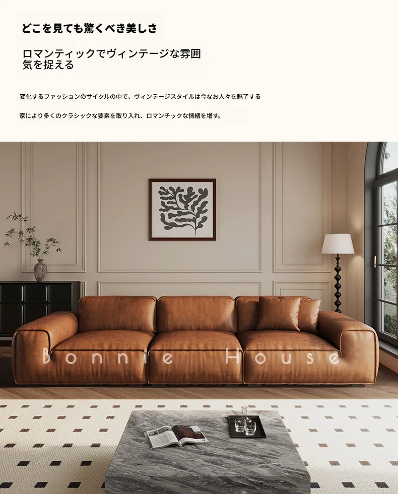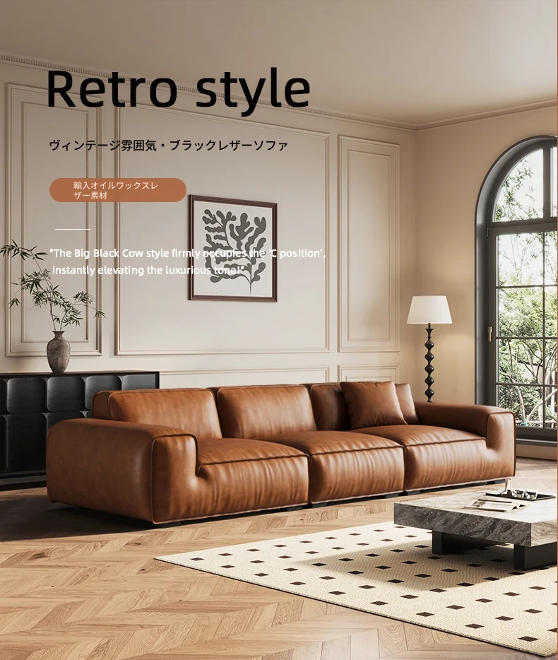 フレンチヴィンテージオイルワックスレザー大黒牛デザインリビングソファ - 深い座面で快適さ抜群、家族皆でくつろげる贅沢な空間を演出!